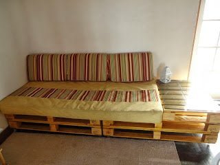 Para o estofado a sugestão mais em conta e rápida é usar um colchão de solteiro e forrar com um bom tecido, de preferencia impermeável. O pallet também combina com futtons e hoje em dia existem de vários tamanhos e tecidos. Agora é só soltar a criatividade!