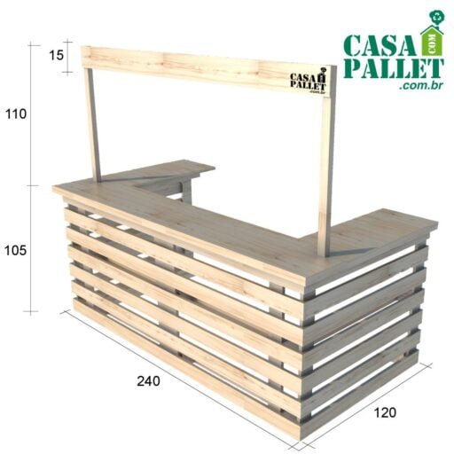 O Bar de Pallet da Casa com Pallet é feito por Módulos e pode-se colocar peças de encaixe para ficar maior. O Módulo em “L” você pode deixá-lo assim ou juntar com outro Módulo Lateral para Bar formando um “U” com total de 240 cm de frente x 102cm de lateral. Caso queira maior basta incluir o Módulo para aumentar a frente, com isso ganha mais 120cm. Este modelo tem as ripas fechadas e prateleira de OSB interna.
